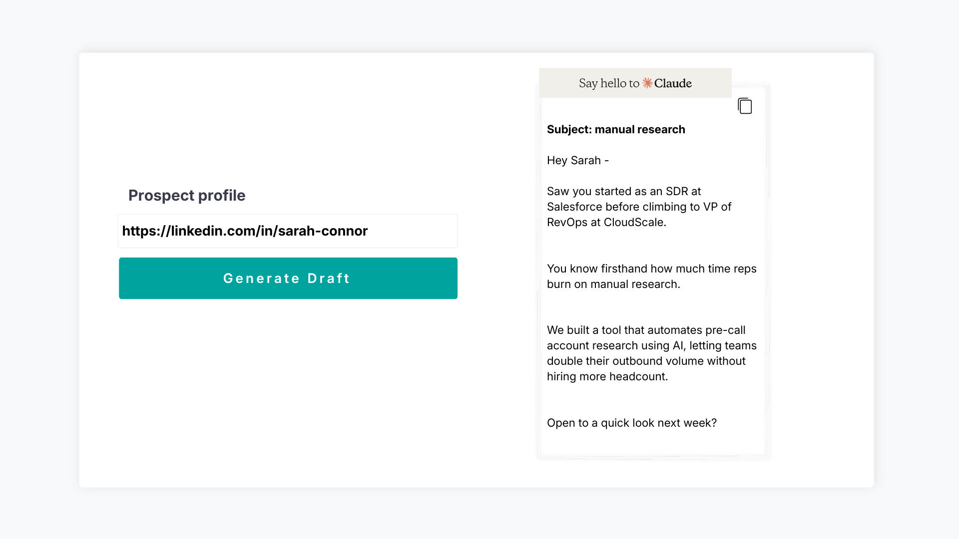 The 1-click AI writer for B2B SDRs. Drop a LinkedIn URL, get a hyper-personalized, non-robotic cold email in 3 seconds.